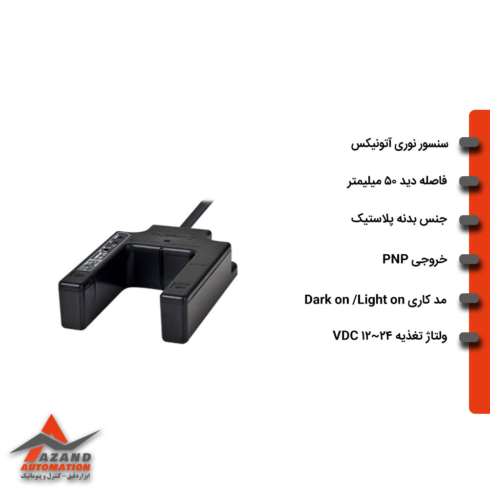 سنسور نوری U شکل آتونیکس مدل BUP-50S-P با فاصله تشخیص جسم 50 میلی متر، رنج رطوبت محیطی 35 الی 85 درصد می توانید از آزند اتوماسیون بهترین قیمت بخرید.